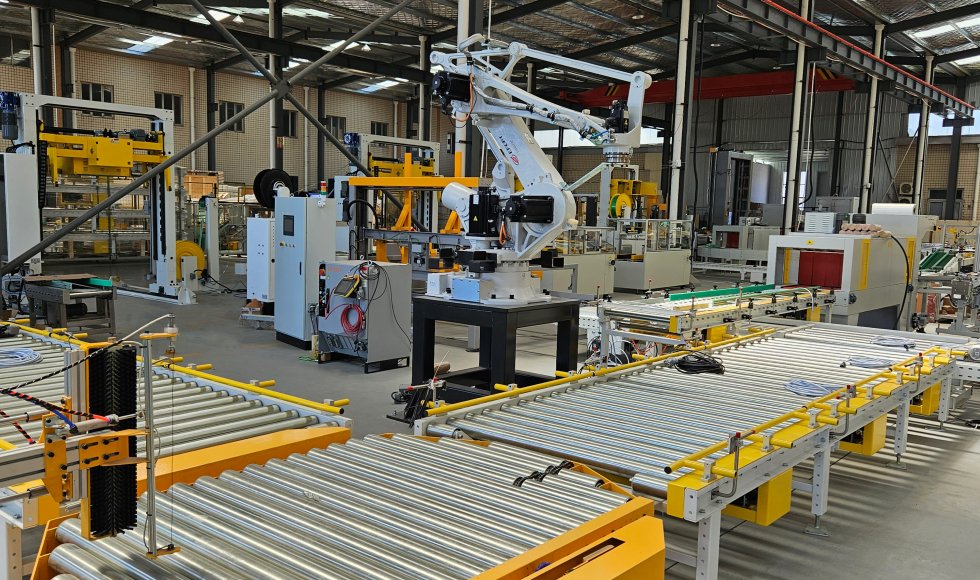 燃料棒自動套膜收縮碼垛包裝線,主要由輸送機、視覺識別、稱重剔除機、自動整理、套膜收縮機、自動供棧機、機器人自動碼垛機、全自動在線纏繞機等設備組合而成。